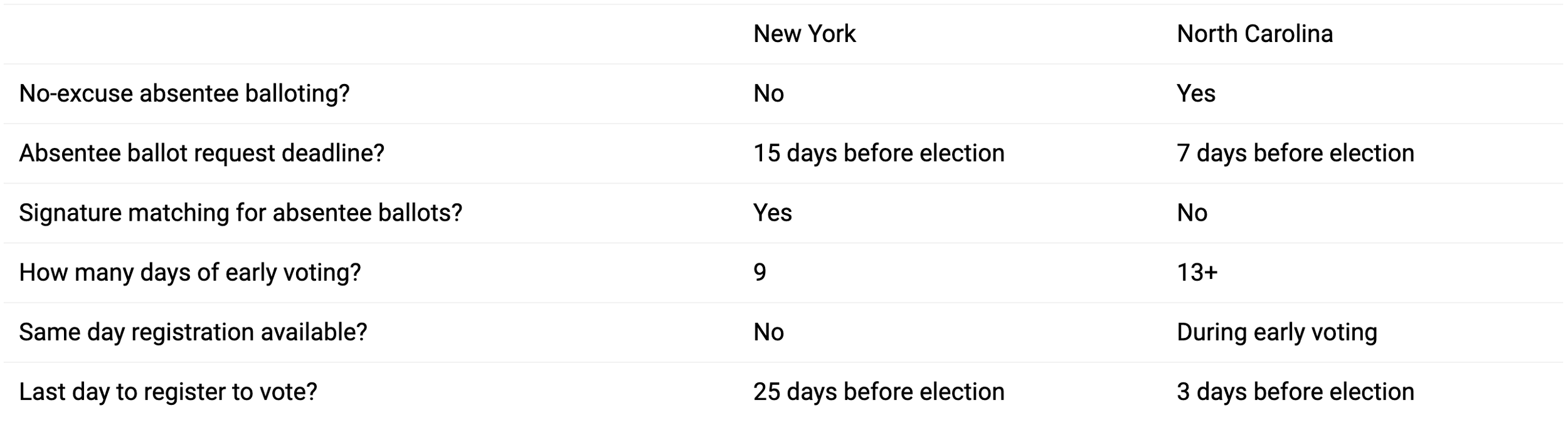 They offer state-by-state breakdowns of the laws governing more than two dozen voting policies. Here’s the breakdown of “Jim Crow 2.0” North Carolina vs. New York, which has Democratic supermajorities: